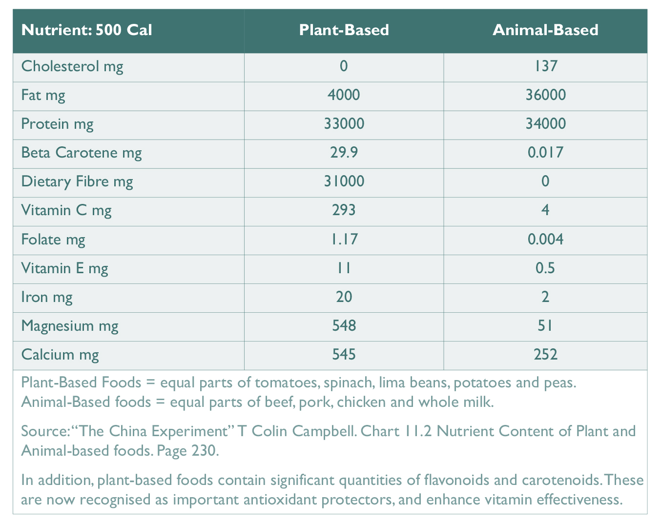 The above table shows the difference in nutritional intake in 500 k/cals of a diet based on animal food when compared with the same intake from 500 k/cals of plant foods. It is easy to see the plant-based diet is much higher in anti oxidants and protective nutrients.