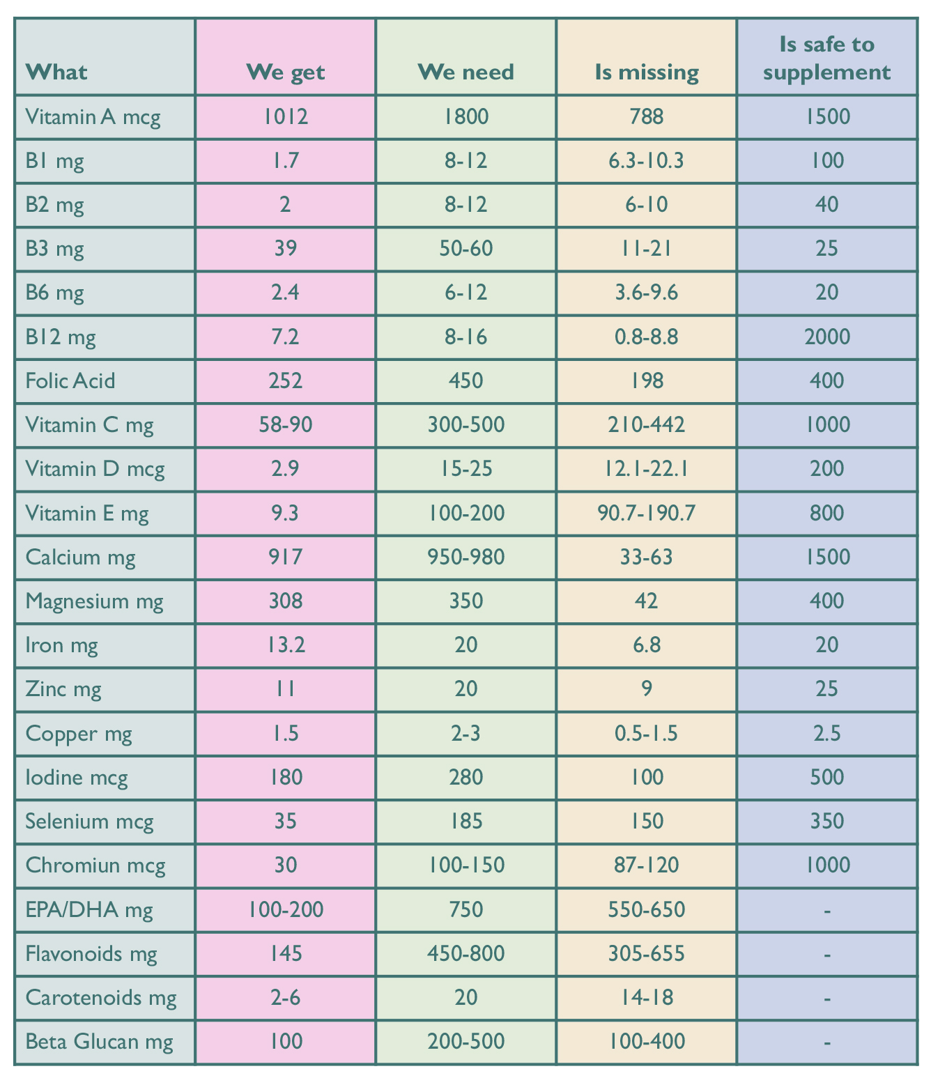 The following tables demonstrates some common shortfalls for essential vitamin and mineral nutrient levels as they presently exist in the Western World. The left hand column in the table lists examples of the nutrients we need for health. Thereafter, (from left-to-right) the pink column shows the levels most of us are achieving from a good western diet. The green column shows the levels we (our physiology) needs for optimum health, and the orange column identifies the corresponding shortfalls (the 'Nutrition Gap'). The levels in this orange column are therefore those we recommend people ingest regularly to avoid shortfalls.