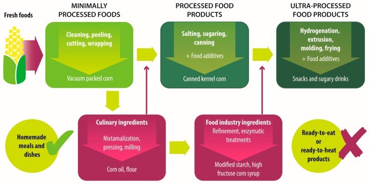 Figure 1. Industrial processing stages, from fresh food to ultra-processed food products. Reproduced with permission from Foods. 2017 Nov 15;6(11). pii: E100. doi: 10.3390/foods6110100.[/caption]