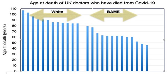 It is interesting that the realisation that dark-skinned populations living in the west are more prone to infectious diseases is not at all a recent one. This has been known for well over 250 years; in a book on history and politics, published in London in 1760, William Douglas MA wrote : “The small-pox in cold countries is more fatal to blacks than whites. In Boston smallpox of 1752, there died whites in the natural way about one in eleven…..;blacks in the natural way one in eight…” [66]. In stark contrast, Nigeria with its population of 200 million has seen very few COVID-19 deaths or serious cases. According to Nigerian press reports, a doctor and Special Advisor to the former President has written at length to attribute this to sunshine and high vitamin D levels [67]. There must be at least as much poverty and nutritional deprivation (and very likely far more) in Nigeria as there is in the UK or the US where far more black people have died of COVID-19. It therefore becomes difficult to sustain the argument that excess deaths of black people in the UK and USA are largely down to poverty, deprivation, and poor nutrition. In this context, the following information and graph at fig 4 from Dr D Grimes, are of interest. The graph shows the age of all doctors who died from Covid-19 in the UK whose obituaries appeared in the British Medical Journal, by broad ethnicity [68]. Although 13 BAME doctors were included, there were a further 10 who did not have their obituaries in the BMJ, making the total number of BME doctors who died of Covid-19 between 25 March and 3 May 23. In that period only 1 white working doctor died from Covid-19 which means that 96% of working doctors who died were of BAME origin. Only one of the white doctors was working and so the rest shown in the graph were presumably retired. The comparison is very interesting as it compares one group of doctors with another who have a roughly similar socio-economic status. It is difficult to argue there was any poverty, deprivation or any other factor involved other than the colour of their skin. It is very clear that while the white retired doctors and one working doctor died at a normal age, all the doctors of BAME origin died well before their time, some up to 30 years before. It is striking that there is no overlap in the ages of death. Although it may be argued that doctors of BAME origin may generally have more co-morbidities than their white counterparts, it should be recognised that these co-morbidities could themselves well be the result of sustained vitamin D deficiency [1,12]. After all, in addition to the Nigerian example above, poor people living in Indian slums but with plenty of access to sunlight also have an incredibly low death rate from Covid-19.
