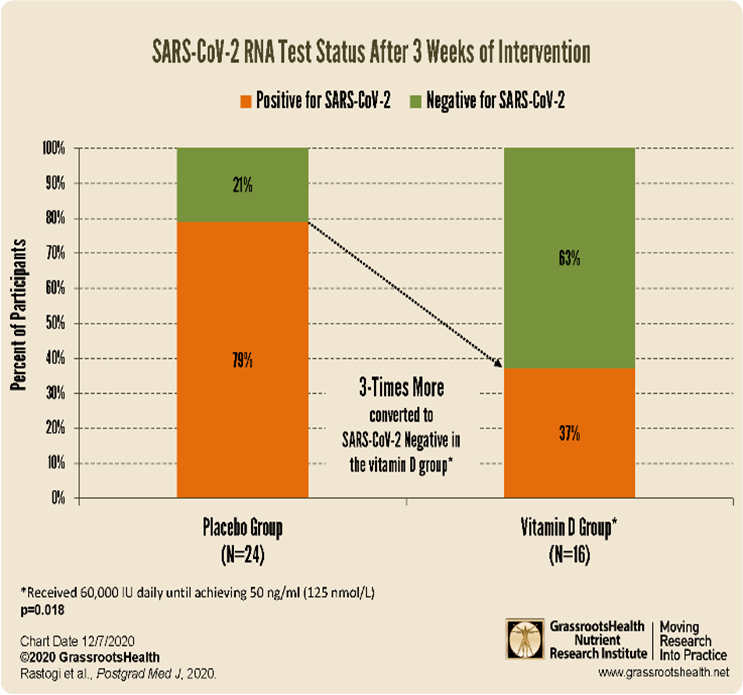 16 were allocated to a high dose vitamin D group which had average starting vitamin D levels of only 8.6 ng/ml (21.5 nmol/l) and 24 to a placebo group with average levels of only 9.5 ng/ml/ (23.7 nmol/l). Of the 16 patients receiving 60,000 IU of vitamin D per day, 10 increased their vitamin D levels to at least 50 ng/ml after 7 days of supplementing, and another two required continued supplementation to reach 50 ng/ml by day 14. By the end of 3 weeks, three times more, or 63% of patients in the vitamin D group became SARS-CoV-2 negative, compared to only 21% of the 24 patients in the control group (p=0.018). Vitamin D intervention was therefore shown to help clear a Covid-19 infection faster in such mild to moderate cases.