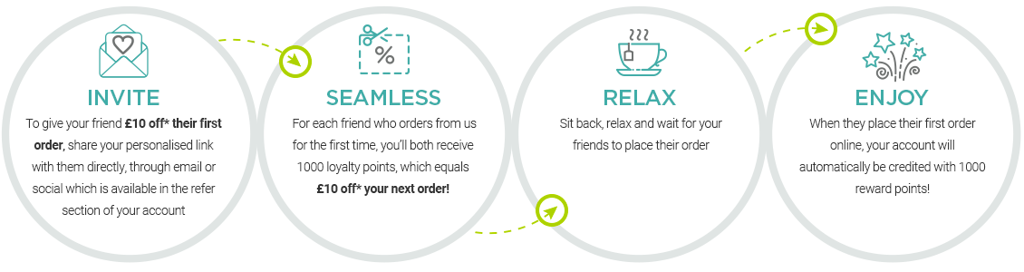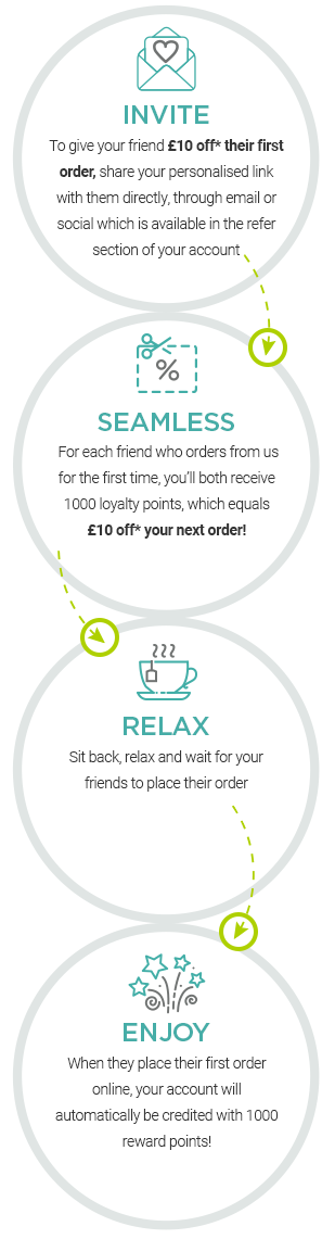 For each friend who orders from us for the first time, you’ll both receive 1000 loyalty points which equals £10 off* your next order!